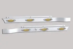 For Peterbilt 589 models. Fit both short hood (121″ BBC) and long hood (131″ BBC). Underlit with 3/4″ round amber clear LED.