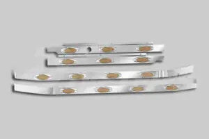 For Peterbilt 579 (including New Model/MLU 579) and 567 models with underbody exhaust. Use with 44″ sleepers without extenders. Underlit with amber clear 3/4″ round LED lights. Measure 2.5″ wide. Not for UltraLoft or EPIQ package.