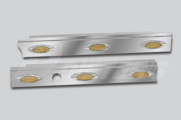 These cab skirts are designed for pre-2022 International HX620 models with dual exhaust. Will not fit 2022+ models. Sold in pairs, each of the cab skirts have 3 amber M1 LED lights. The skirts measure 4″ wide. There is a cutout in the driver side panel for a block heater. Lights, hardware and harnesses included.